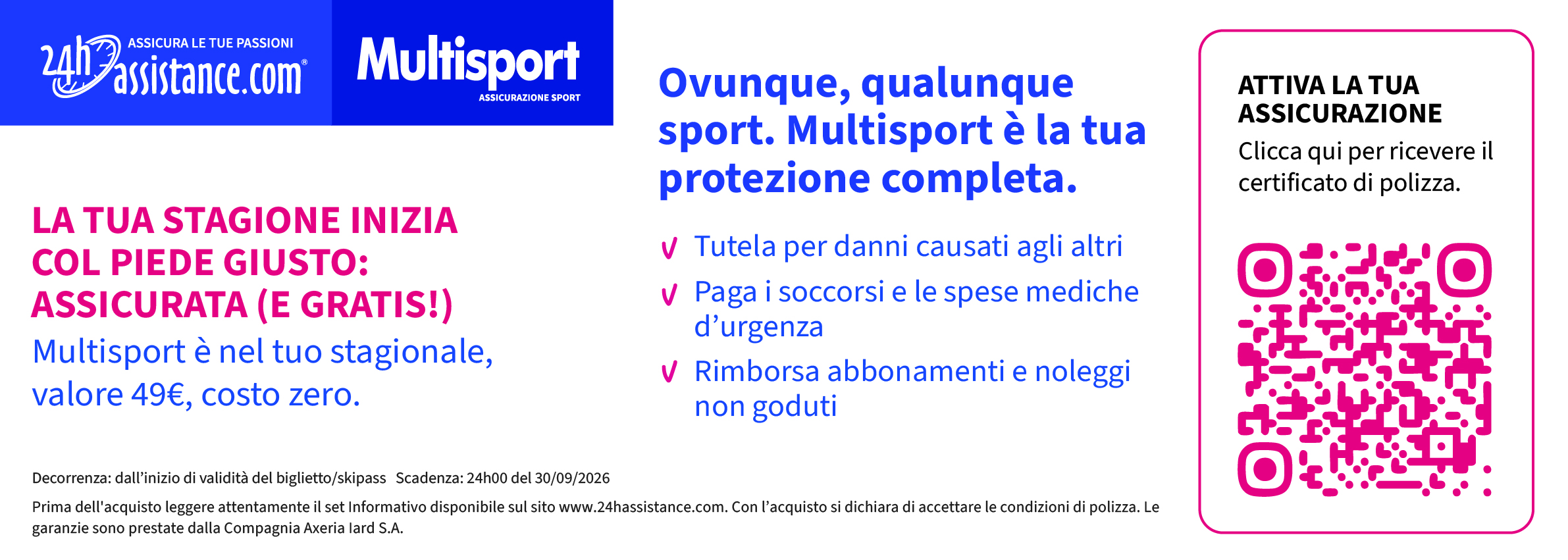 The Espace San Bernardo seasonal skipass includes l'assurance accidents, service de premier soin, assistance et couverture de responsabilité civile envers les tiers obligatoire à partir du 1er janvier 2022 (Décret-loi 40/2021).
